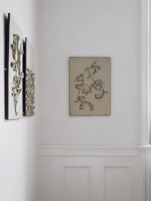 In a playful interaction between medias, in Mellemrum we can see how painting are taking shape and volume, and viceversa, ceramic sculptures are immortalised on the surface of canvases. But what lays between those two dimensions? The contrast between those two dimensions create an intangible place, is that a real space or it may be just an illusion, an idea, a concept? With those question in mind the artists curate the exhibition, delving into the abstract realm of space and place, opening up for the viewer own interpretation.